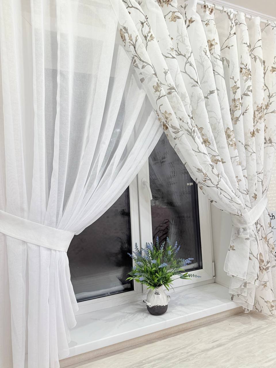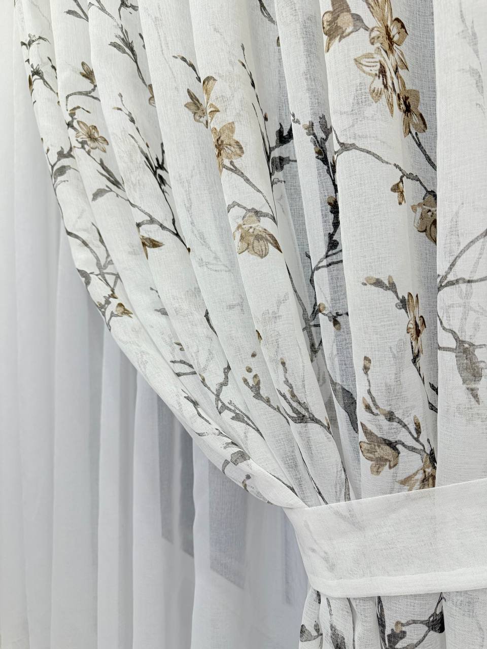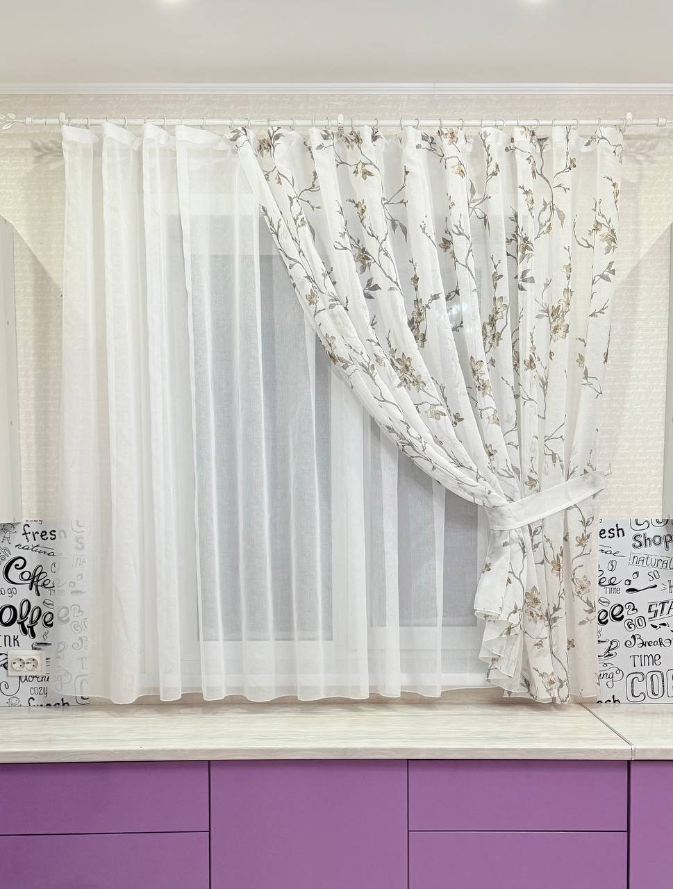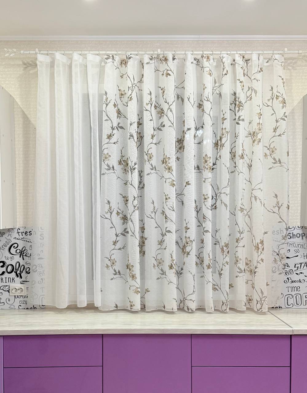 Шторы для кухни Сакура с подхватами ширина 4м высота 1,7м Ткань под лён. Льняной тюль очень практичен: он удобен в эксплуатации и не нуждается в особом уходе. Занавески просто стирать при 30 градусах, они мало подвергаются загрязнениям, не поддаются электризации и даже могут снимать уровень вредного излучения, которое исходит из электрических приборов. Шторы из льняной ткани выполняют функцию «естественного кондиционера», поскольку зимой они согревают помещение, а летом наполняют его прохладой. Поэтому ткань лен широко используют для пошива штор
